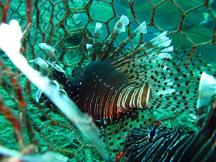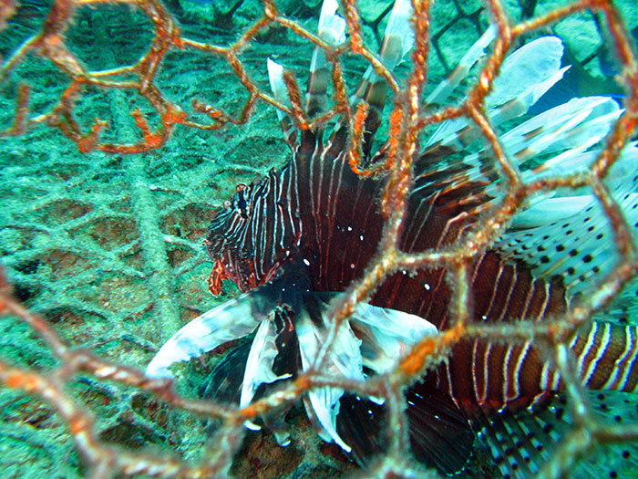 Estas tomas realizadas en fecha 10/08/2013, despues del primer reporte, muestran dos ejemplares de pez león ingresando en una nasa pesquera. Foto: Humberto Ramírez Nahim